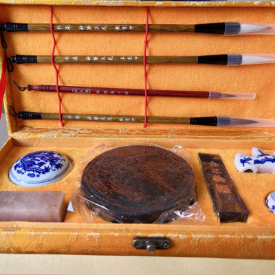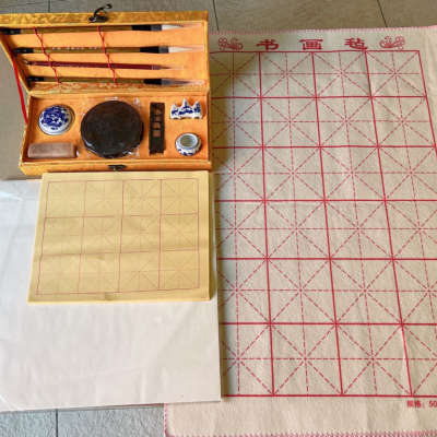四支毛笔套装(羊狼兼)+印章+印泥+防摔砚台+二两青墨+笔山+水池+50张毛边米字格字帖+10张白宣纸+一张书画毡